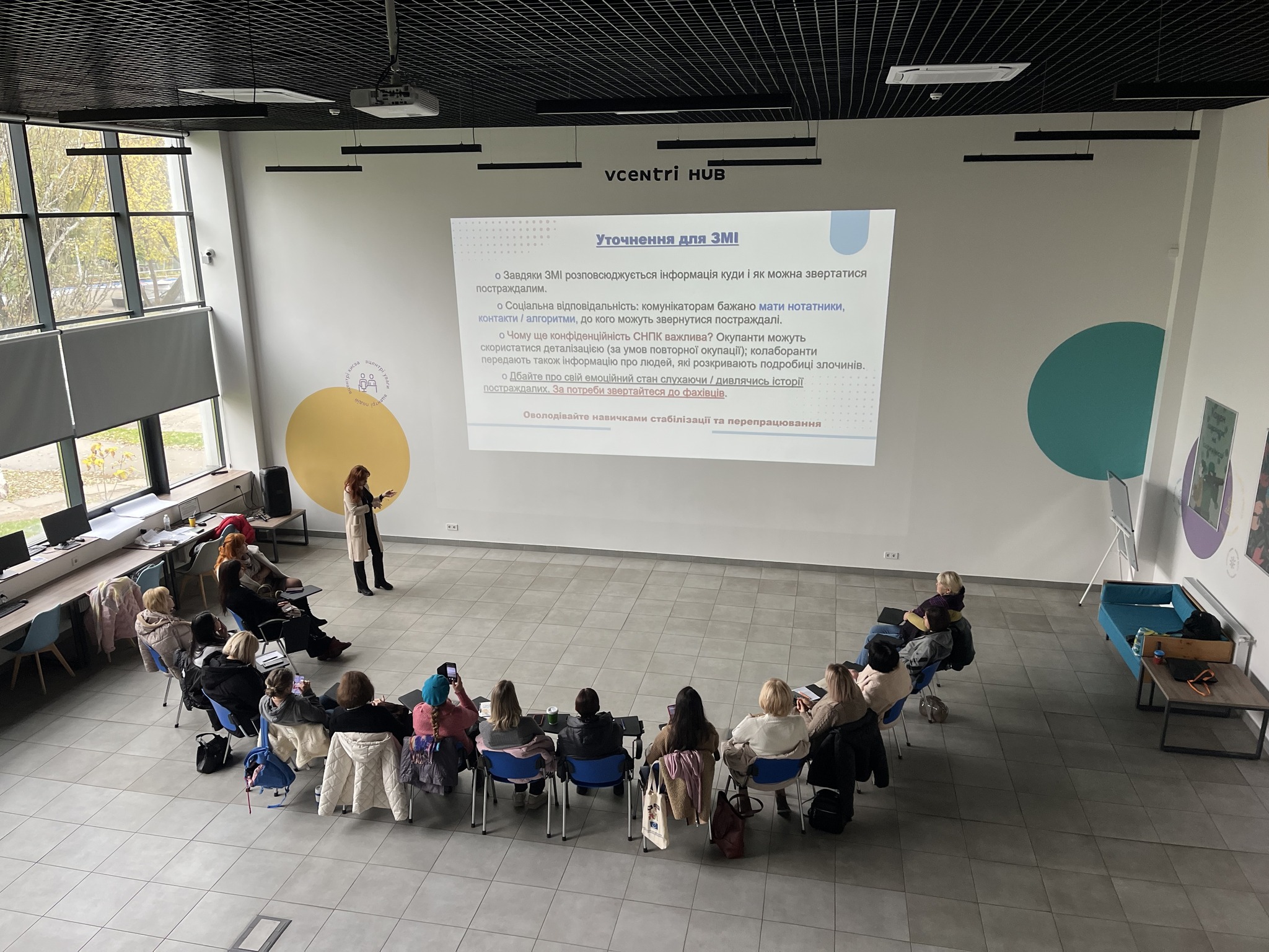 Понад 120 фахівців пройшли навчання щодо того, як правильно та безпечно спілкуватися з постраждалими, як не нашкодити словом і як підтримувати людей, які пережили травматичний досвід. Зокрема організовано 8 тренінгів «Етична та чутлива комунікація: як говорити проскладні теми СНПК» для фахівців відділів освіти, охорони здоров’я, служби усправах дітей та сім’ї, соціальної сфери, внутрішньої політики (зв’язків з громадськістю) РДА, а також працівників Телеканалу «Київ», пресцентру«Київінформ» та Центру комунікації – всього 98 жінок і 24 чоловіка.